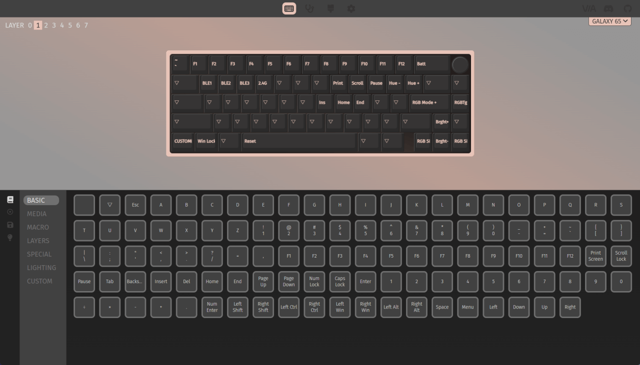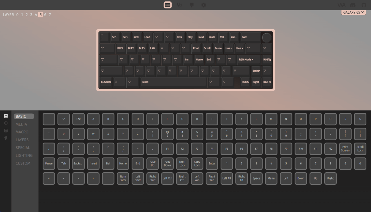 『EPOMAKER Galaxy65 メカニカルキーボード』は、VIAソフトウェアを使用することで、各キーの機能をカスタマイズし、リアルタイム表示でレイアウトを再割り当てすることができます。更にマクロをプログラムして様々なプロファイルも作成することができます。