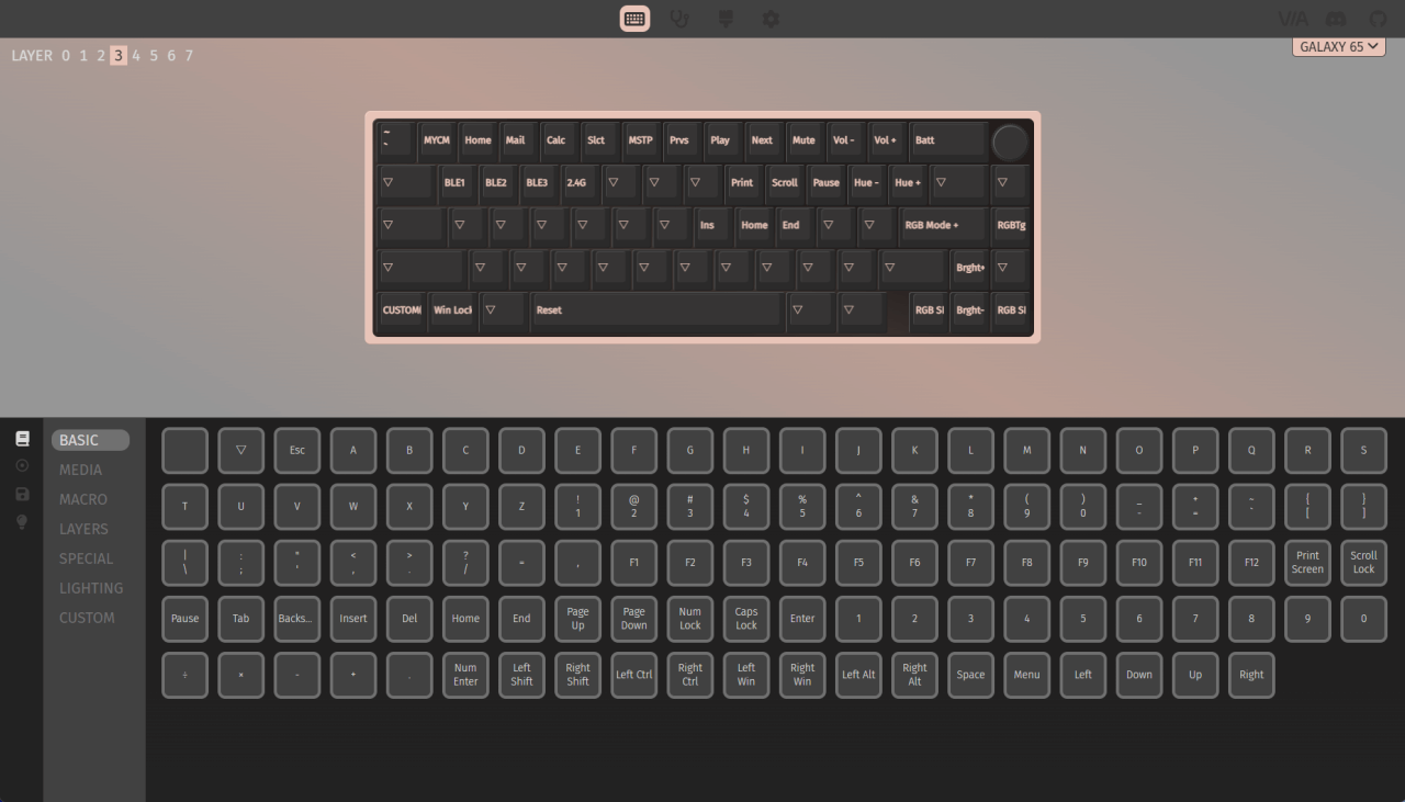 VIA環境構築後、『EPOMAKER Galaxy65 メカニカルキーボード』のキーマップを変更・反映させることがができます。レイヤーは8パターンあります。