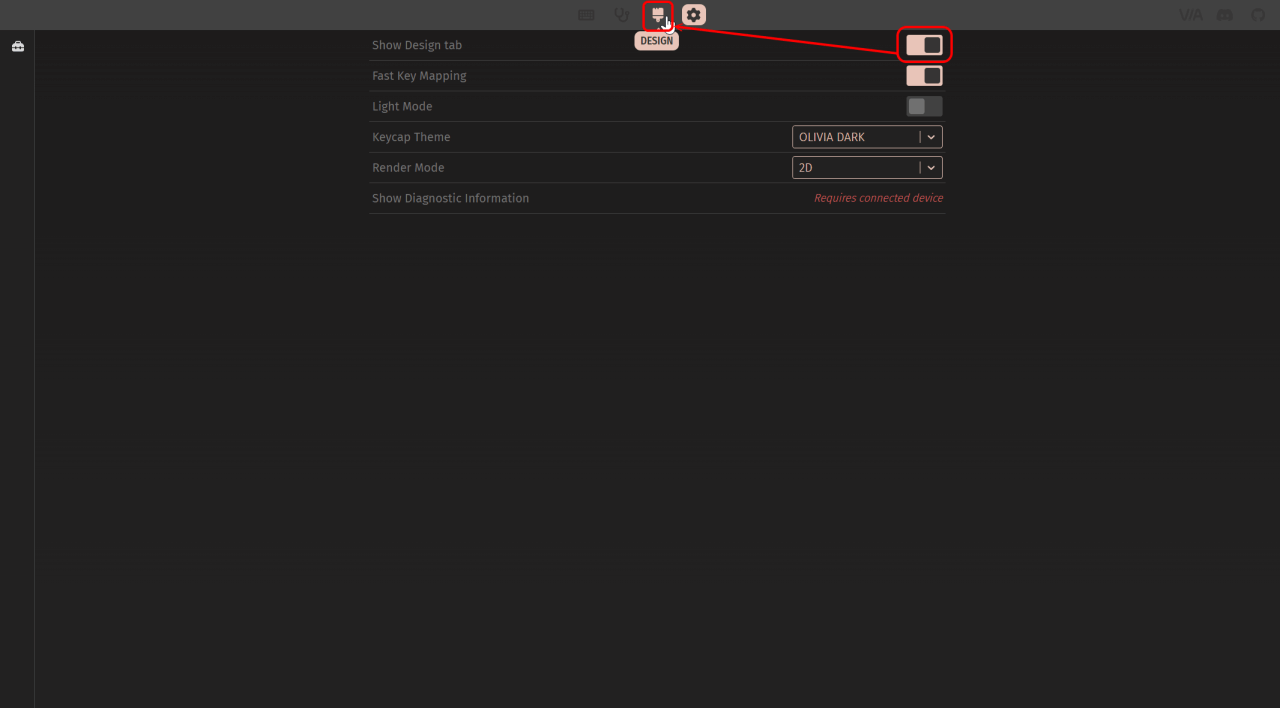 「Show Design tab」設定項目をオンにすると、【ペンキの刷毛(DESIGN)】アイコンが表示されるので選択します。