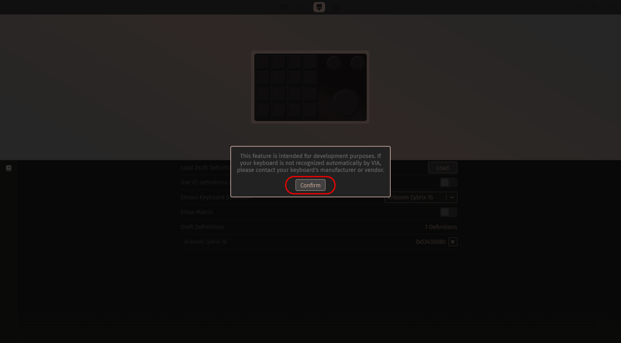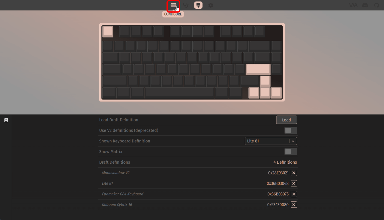キーマップのプロファイルがインポートされて、VIA環境が構築されました。キーアップを自分の環境に合わせて設定していきます。