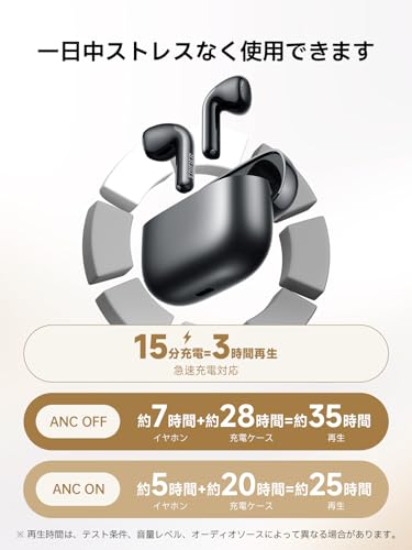 - 【超長時間バッテリー継続と急速充電機能】単体で最大7時間使用可能です。充電ケースを使用すると最大35時間バッテリー継続使用が可能です(ノイズキャンセリング機能オフ時)。急速充電機能により、15分の充電で3時間の使用が可能です。