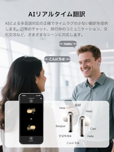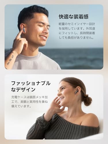 - 【快適な装着感とファッショナブルなデザイン】軽量なセミインイヤー設計であり、外耳道にフィットするため負担なく長時間装着できます。充電ケースは鏡面メッキ加工を採用し、美観と実用性を実現しています。