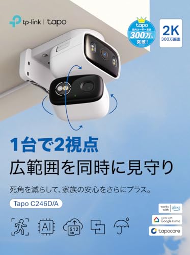 【広角&遠視2眼レンズ搭載】Tapo 防犯カメラ 屋内外対応 360°首振り 広角&遠視2眼レンズ パンチルト デュアルレンズ搭載 高画質 2MP 300万画素 フルワイヤレス IP65防水防塵 フルカラーナイトビジョン スマート人物検知 Amazon Alexa/Google Assistant対応 Tapo C246D |