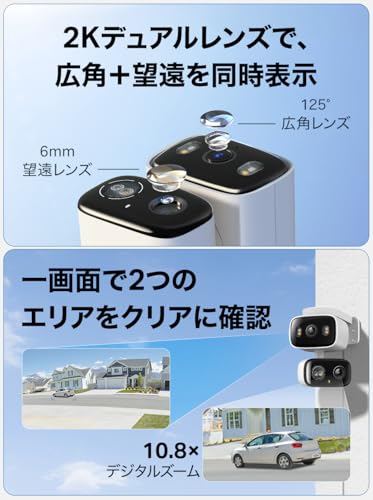 - デュアルレンズ搭載:125°の視野角を持つ固定レンズ(広角)とパンチルトレンズ(6mm望遠)を備え、広範囲を細部までクリアに捉えます。